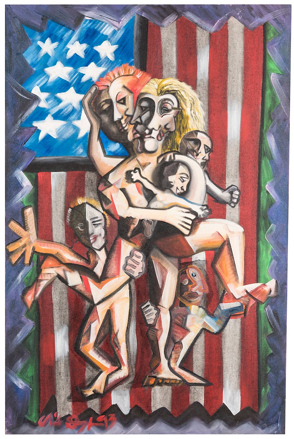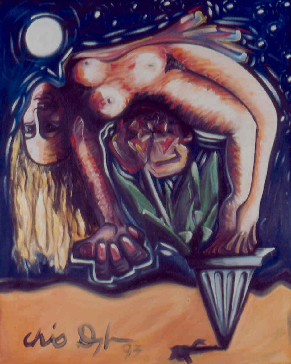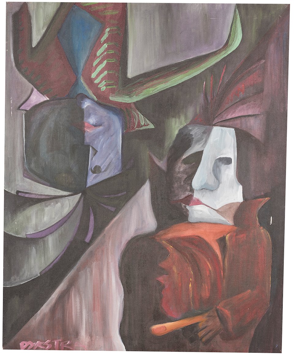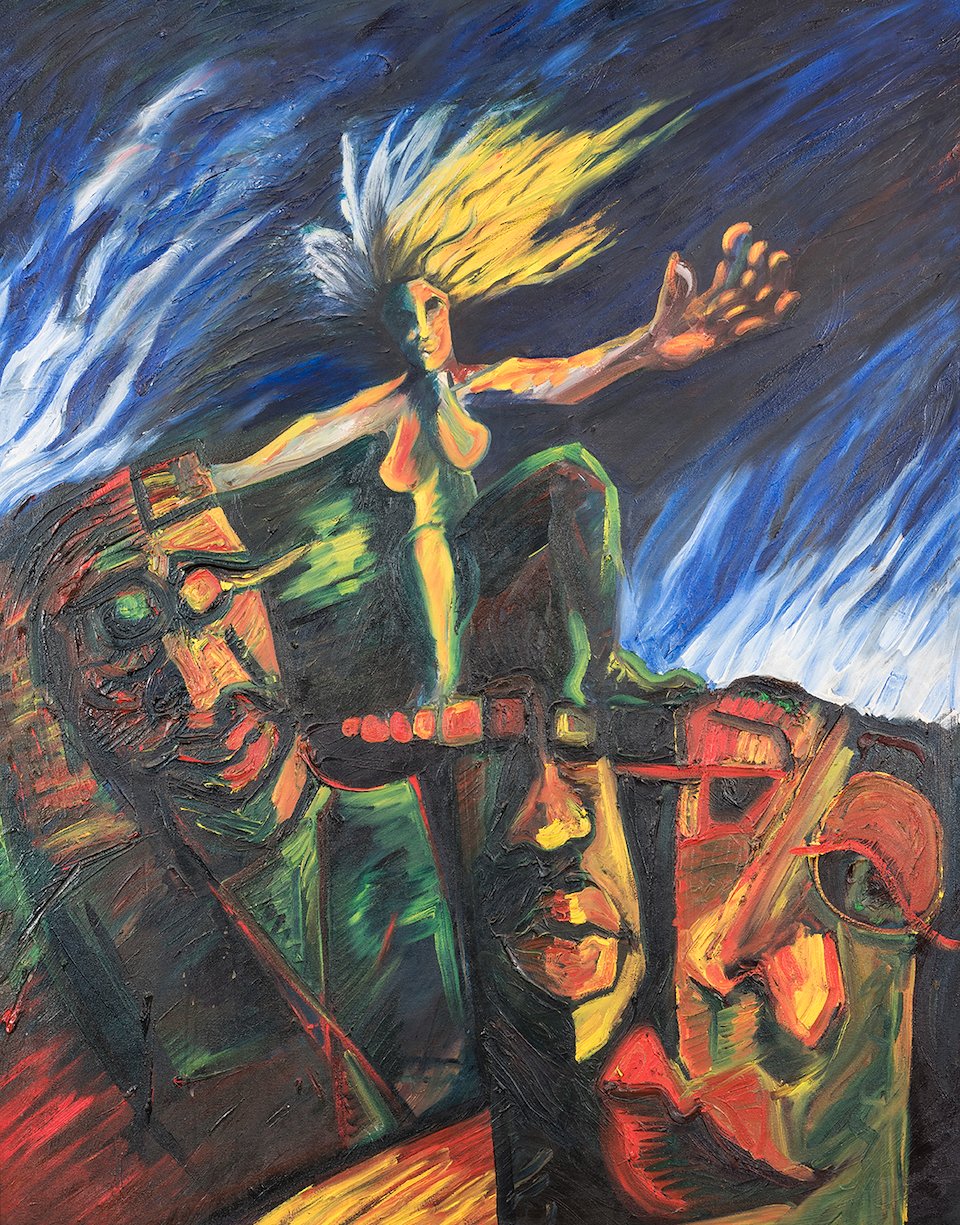 Woman Dancing in a Field of Masks, 1997, 48"x40", oil on canvas