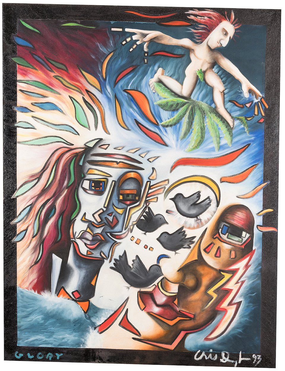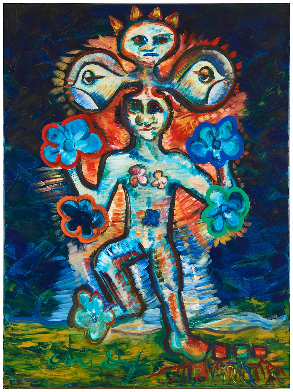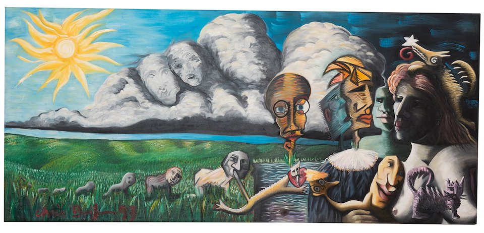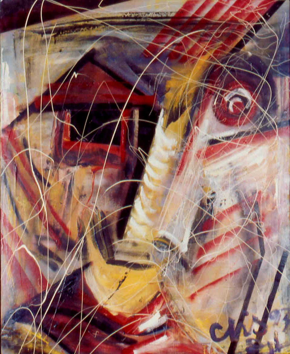 Woman Dancing in a Field of Masks, 1997, 48"x40", oil on canvas