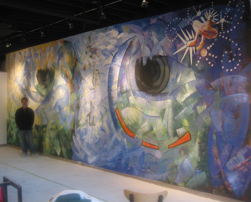 The artist with Under Fat Moon Dreaming, 2003, Latex house paint on drywall, 12′ x 32′