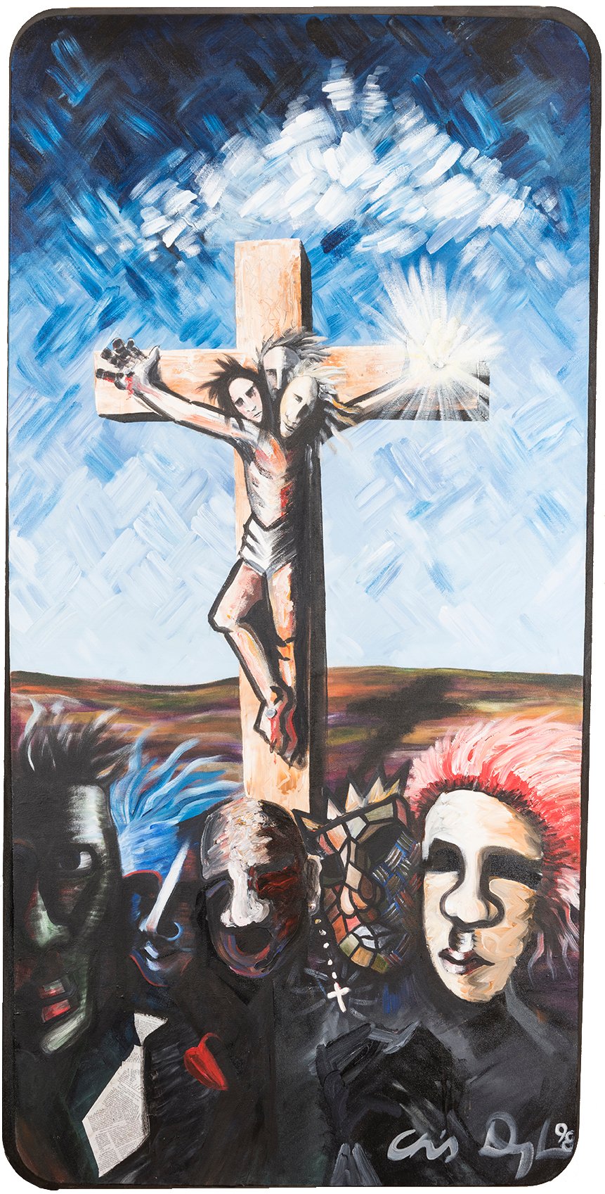 1998, Acrylic, latex house paint, cut up bible, glue on canvas stretched over a single bed frame.