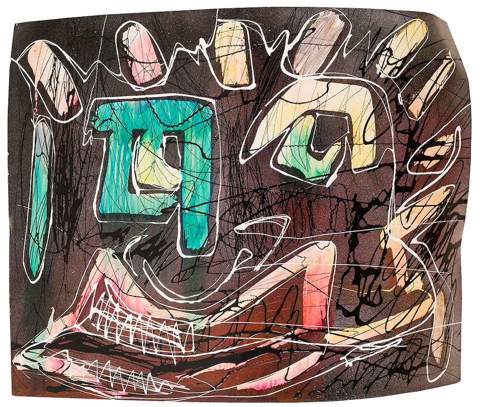 Rage, 1992, 40"x40", spray paint, oil, plastisol, vinyl ink on canvas